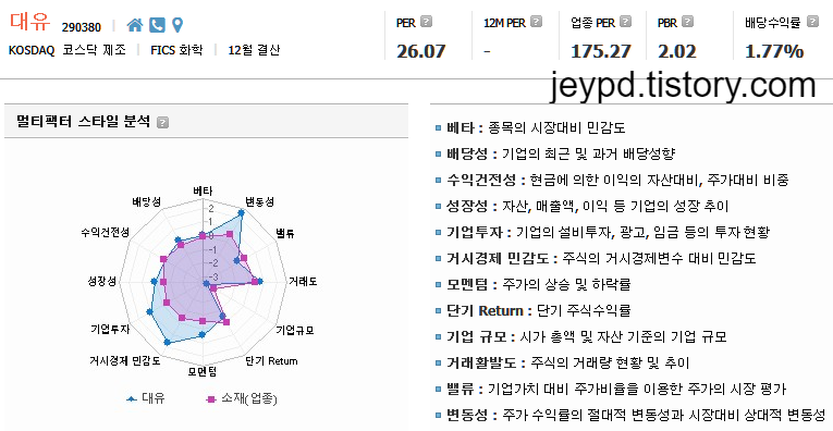 - 변동성 : 주가 수익률의 절대적 변동성과 시장대비 상대적 변동성