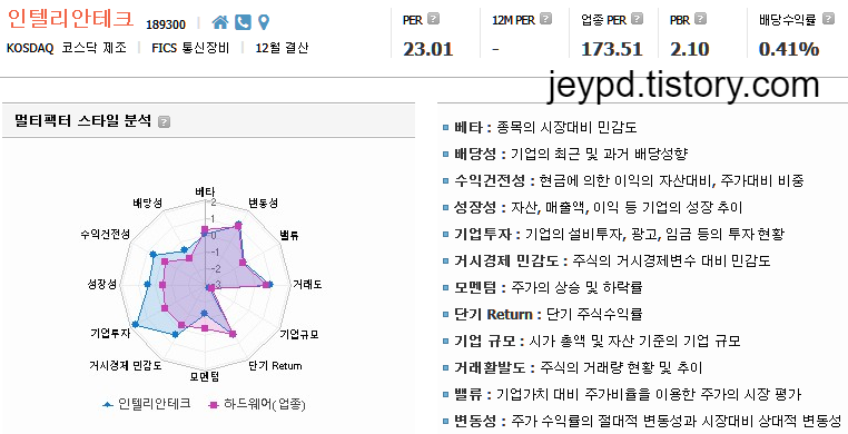 - 변동성 : 주가 수익률의 절대적 변동성과 시장대비 상대적 변동성