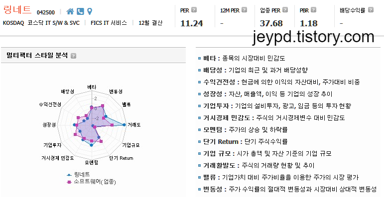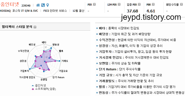 - 변동성 : 주가 수익률의 절대적 변동성과 시장대비 상대적 변동성
