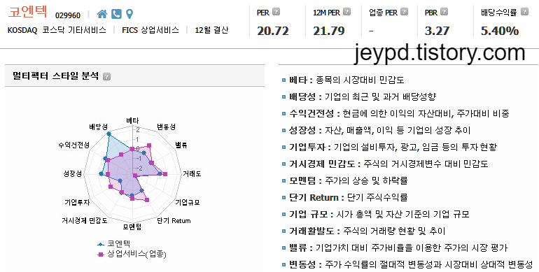 - 변동성 : 주가 수익률의 절대적 변동성과 시장대비 상대적 변동성