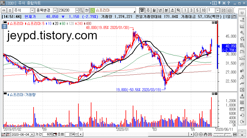 슈프리마 주가가 오른다면 슈프리마에이치큐도 같이 따라갈 확률이 높고, 반대로 끌고 갈 수도 있습니다.