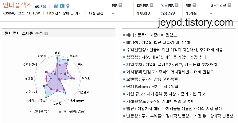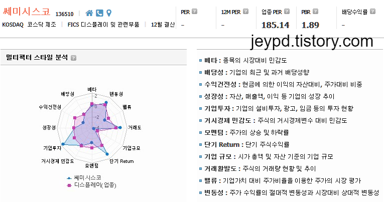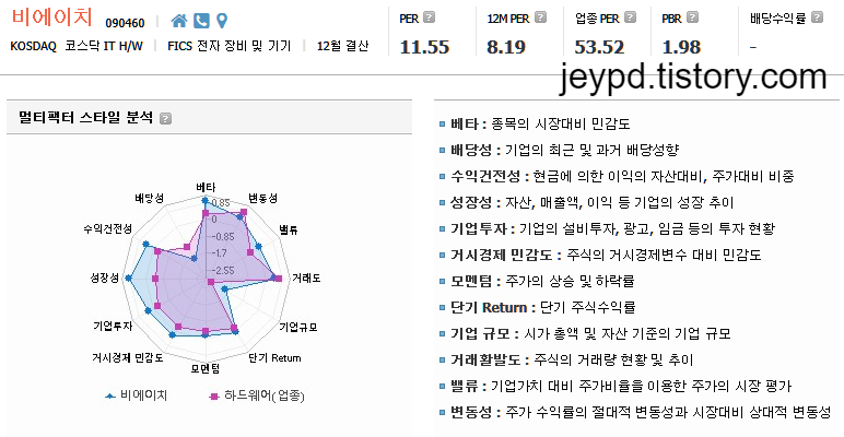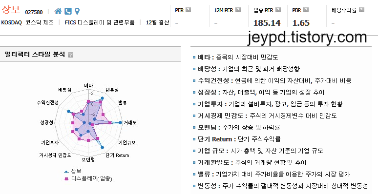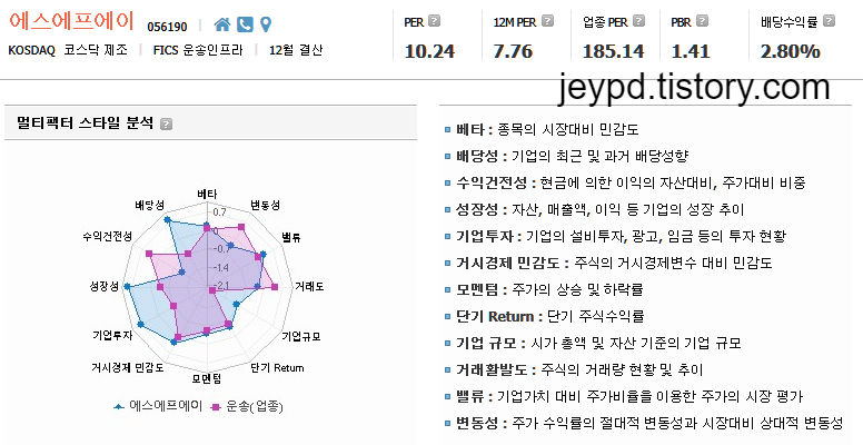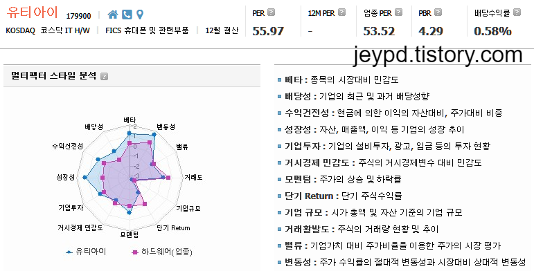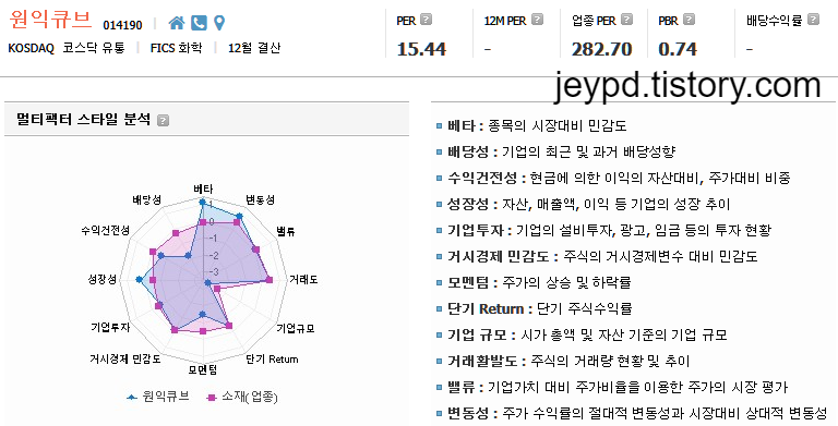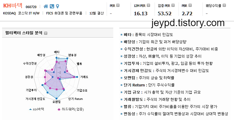- 변동성 : 주가 수익률의 절대적 변동성과 시장대비 상대적 변동성