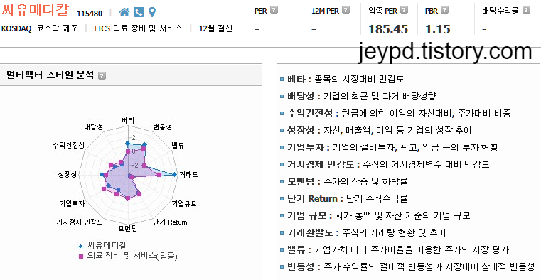 - 변동성 : 주가 수익률의 절대적 변동성과 시장대비 상대적 변동성