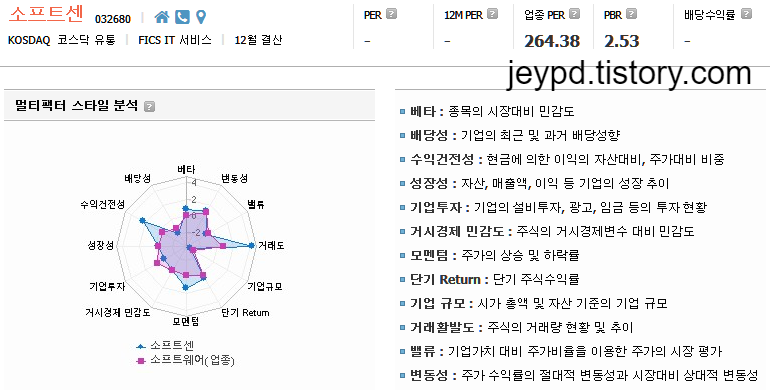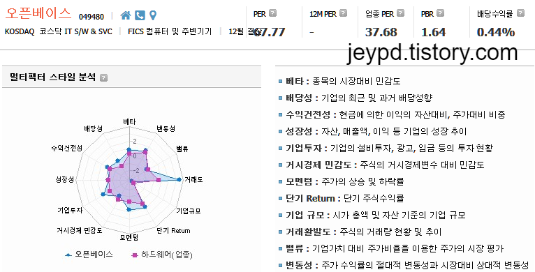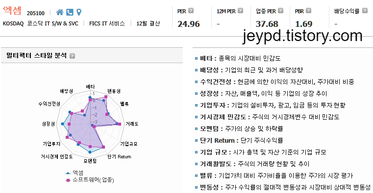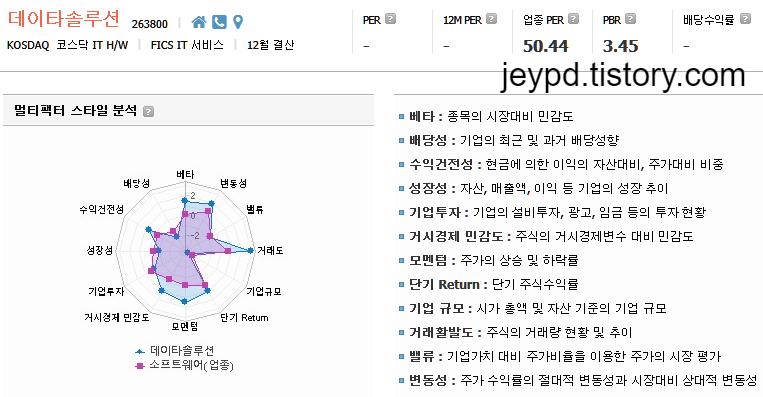 - 변동성 : 주가 수익률의 절대적 변동성과 시장대비 상대적 변동성