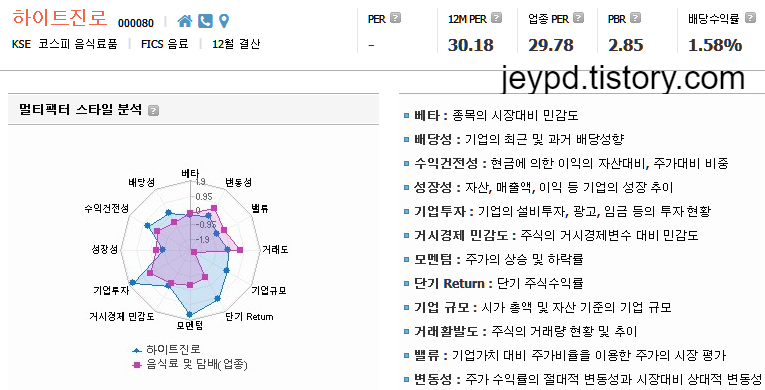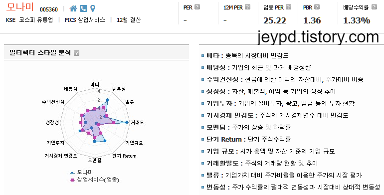 - 변동성 : 주가 수익률의 절대적 변동성과 시장대비 상대적 변동성